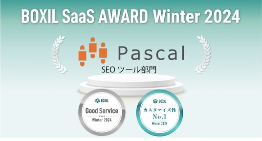 「BOXIL SaaS AWARD(ボクシル サース アワード)」は、SaaS(※)比較サイト「BOXIL SaaS(ボクシル サース)」を運営するスマートキャンプが、優れたSaaSを審査、選考、表彰するイベントです。今回の「BOXIL SaaS AWARD Winter 2024」は、2023年10月1日~2024年9月30日までの1年間に「BOXIL SaaS」上へ新たに投稿された口コミ約13,000件をもとに審査しています。今回「パスカル」はSEOツール部門にて「Good Service」のほか、「カスタマイズ性」の項目でNo.1を受賞しました。