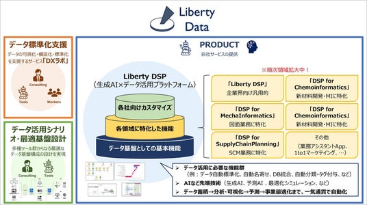 - 生成AIなど先端技術を取り入れた自社開発のデータ活用プラットフォーム「Liberty DSP」を提供、汎用的なタイプに加え領域特化タイプも提供(図面・SCM・新材料開発など順次領域拡大中)