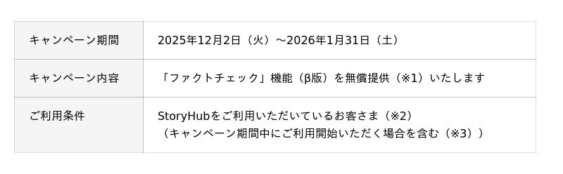 「ファクトチェック」機能(β版)のリリースを記念して、StoryHubをご契約のみなさまに「ファクトチェック」機能(β版)を無償提供いたします。ぜひこの機会にお試しください。