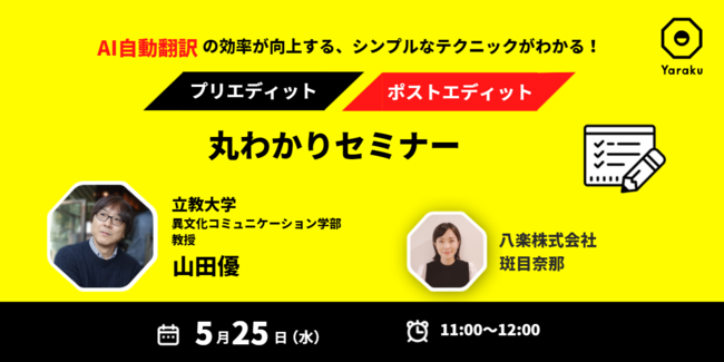 今回のオンラインセミナーは、AI自動翻訳の精度を高める「プリエディット・ポストエディット」のコツやテクニックについて、二部制で情報をお届けします。第一部ではAI翻訳研究の第一人者である立教大学教授の山田優が、プリエディット・ポストエディットのコツについて解説。第二部ではシンプルでセキュアなAI翻訳ツール「ヤラクゼン」を使い、プリエディット・ポストエディットを簡単に行う方法をご案内します。