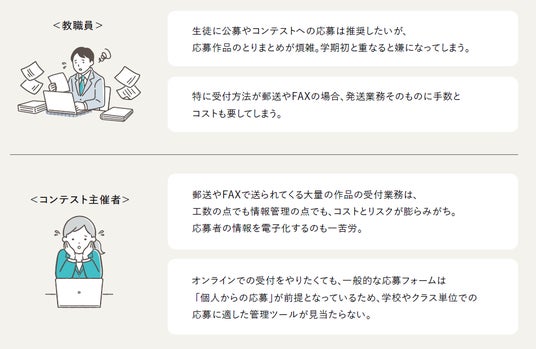 学生を対象とした公募やコンテストにおいては、教職員が学校やクラス単位で作品をとりまとめて応募するケースが多く、また応募方法はいまだ郵送メインというのが実情です。教職員やコンテスト事務局においては、