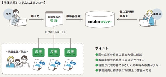 株式会社公募ガイド社(代表取締役:浅田邦裕、本社:東京都港区、以下「公募ガイド社」)は、コンテスト運営SaaS『Kouboプランナー』において「学校・団体向け一括応募システム」を追加リリースしました。「学校・団体向け一括応募システム」は学校側で生徒の作品をまとめてオンライン応募するためのシステムで、教職員・コンテスト事務局双方の運営業務負荷を大幅に削減することができます。