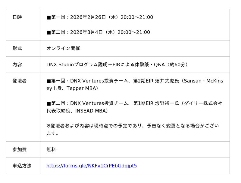DNX Ventures(本社:東京都千代田区、マネージングパートナー兼日本代表:倉林陽、以下「DNX」)は、当社が運営するベンチャースタジオ「