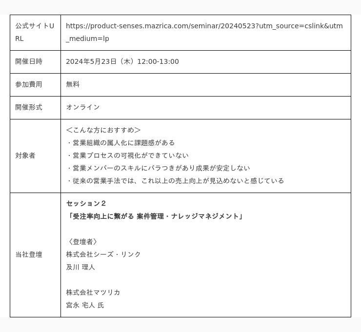 シーズ・リンク(riclink)、5月23日(木)開催マツリカ社主催のセミナー「受注率向上の戦略~アポ獲得からクロージングまでのプロセスを最適化~」に登壇