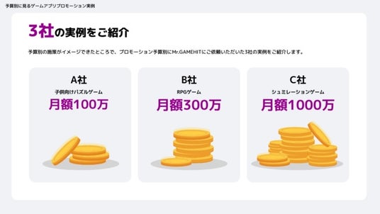 また、プロモーション予算別にMr.GAMEHITにご依頼いただいた3社の実例もご紹介しています。