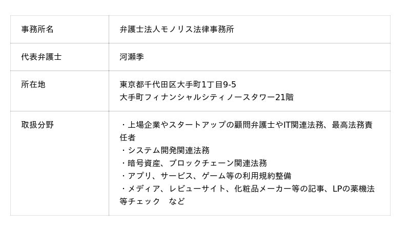 モノリス法律事務所は、IT・インターネット・ビジネス分野に強みをもつ法律事務所です。元ITエンジニアの弁護士が代表を務め、IT企業の顧問業務、システム開発紛争、誹謗中傷対策、Webサービスの適法性リサーチなど、高度な専門知識を要するリーガルサービスを提供しています。常にビジネスの現場に寄り添い、法を武器にクライアントの課題解決と成長を支援いたします。