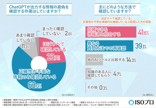 【まとめ】ChatGPTの出力情報を信じている方は約9割、しかし必要に応じて出力情報の確認が必要今回の調査で、多くの企業においてChatGPTが日常業務に取り入れられる中で、さまざまなメリットとともに、今後の課題が示されました。