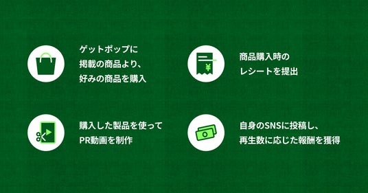 ゲットポップは、SNSへの投稿の再生数に応じて報酬がもらえるサービスです。ユーザーは、ゲットポップに掲載されている商品から好きなブランドの商品を購入し、商品をPRする動画をSNSに投稿するだけで、再生数に応じた報酬を受け取ることができます。