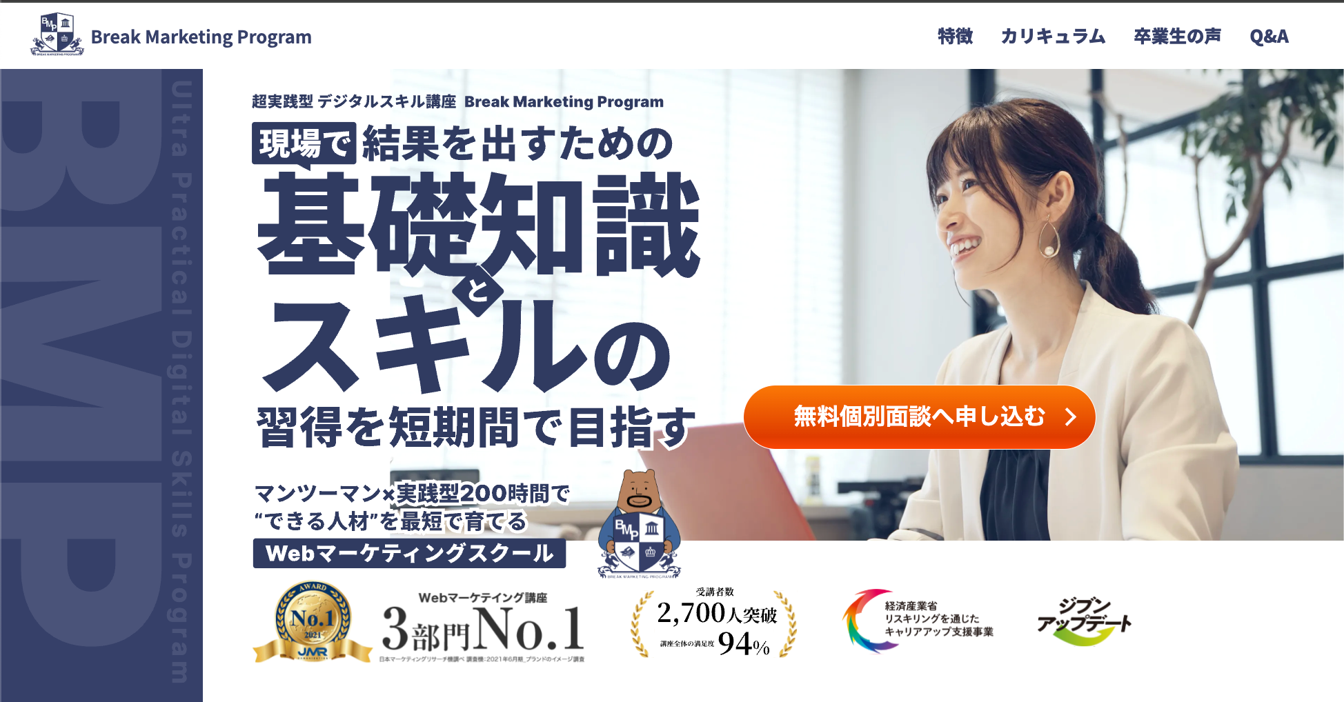 ■ BMP(Break Marketing Program)について BMPは、Webマーケティング未経験者でも実務で成果を出すことを目的に設計された実践型スクールです。