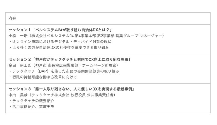 株式会社ベルシステム24(本社:東京都港区、代表取締役 社長執行役員:野田 俊介、以下:ベルシステム24)は、テックタッチ株式会社(本社:東京都港区、代表取締役 CEO:井無田 仲、以下:テックタッチ)と共同で、「神戸市が実践する誰一人取り残さないデジタル・ディバイド対策とは?(以下:本セミナー)」を、2月22日(水)に開催します。