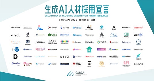 GUGAでは、「生成AI人材採用宣言プロジェクト2024」と題して、多くの企業・団体さまとともに、生成AI人材を採用する意志を表明する共同プロジェクトに取り組んでいます。本プロジェクトは、生成AIを活用するリテラシーおよびスキルの必要性を求職者に訴えかけ、日本社会が前進するきっかけを創出することを目的とし、2024年1月10日時点で66の企業・団体さまにご賛同いただいています。ご賛同いただける企業・団体さまは下記URLより募集要項をご確認のうえ、エントリーをお願いいたします。
