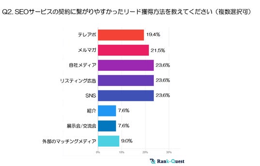 https://rank-quest.jp/column/column/how-to-seo/ SEO支援実績4300社を誇るランクエストがSEO支援会社で勤務経験がある144名にリード獲得実態を調査