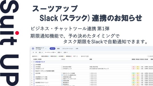 今般、当社では、スーツアップが、当該機能において、ビジネス・チャットツール「Slack」(スラック)と連携できるようになったことをお知らせします。