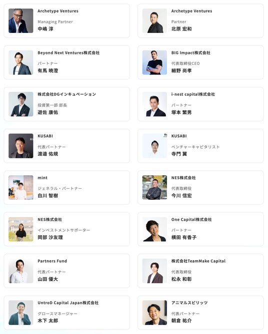 開催3年目となる本年は、過去最多となる24社・30名の有力ベンチャーキャピタリストが参加。これほど多くの投資家が一堂に会し、スタートアップと個別面談を行う機会は国内でも極めて稀であり、本プログラムは国内最大級の資金調達支援プログラムとなります。