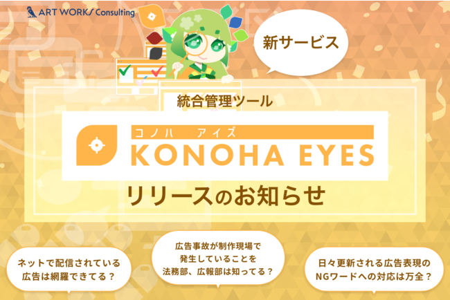 広告監修およびコンサルティング業務を手掛ける、株式会社アートワークスコンサルティング(所在地:東京都渋谷区東3丁目15-9 プライムハウスII 2階、代表取締役:高橋聡)は、2023年4月17日に配信した広告の統合管理ツールとなる新サービス『KONOHA EYES』をリリースいたしました。