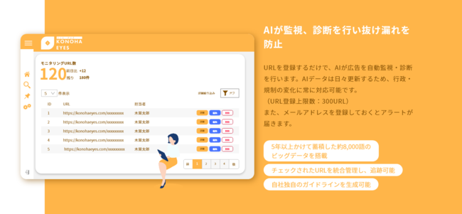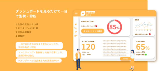 『KONOHA EYES』は2019年に特許を取得した『ツクヨミ』のビックデータを活用し、配信された広告表現のチェックを自動で行うことが可能となります。さらに、広告のチェックだけでなく、配信した広告の管理を行い、リスクの高い広告を簡単に確認できたり、AIが自動で広告の監視・診断を行うことが可能となります。