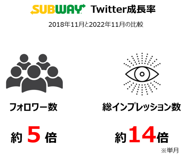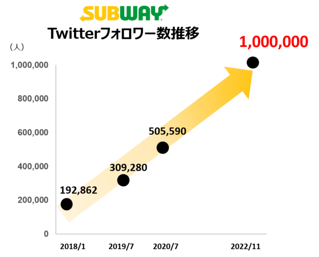 コミュニティマーケティングを手がける総合広告会社の株式会社日宣(本社:東京都千代田区、代表取締役社長:大津 裕司、以下「日宣」)がマーケティング支援するサンドイッチチェーン「サブウェイ」の公式Twitterアカウントのフォロワーが100万人を突破したことをお知らせいたします。当社が責任広告代理店として2018年秋から運用管理を開始してからおよそ4年でフォロワー数は約5倍に、月間インプレッション数は約14倍に成長しました。