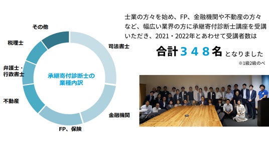 そこで当協会は、遺贈寄付の普及と促進を目的として、遺贈寄付の専門知識を身につけた、承継寄付診断士を育成するセミナー事業を2021年より開始。遺贈寄付を希望される方々が相談できる専門家の不足に対応するため、情報発信や勉強会を通じて寄付を無理なく実現できる体制を整える取り組みを行っています。