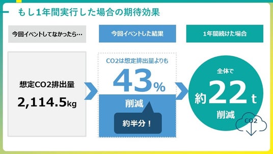 もう一つの大きな成果は、主催者側のLinkholaにとっても当初の予想を上回る削減率をたたき出したことです。このプロジェクトを行わなかった場合の全体の予想CO2排出量は2,114.5kgでしたが、各社の取組結果により