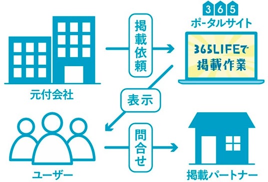 大手不動産会社等の物件は365LIFEに掲載をして、反響をエリアの掲載パートナーにおつなぎする仕組みです。最小の掲載労力で最大の集客効果を実現します。