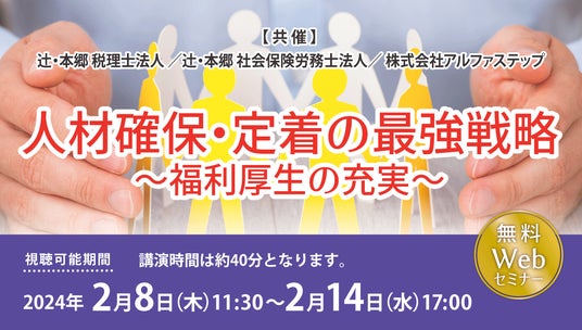 辻・本郷 税理士法人(本社:東京都新宿区、理事長:徳田孝司)は、辻・本郷 社会保険労務士法人(本社:東京都新宿区、代表社員:阿部新一)と株式会社アルファステップ(本社:東京都新宿区、代表取締役:本郷孔洋)と共催で、2024年2月8日(木)より「人材確保・定着の最強戦略~福利厚生の充実~」セミナーを開催いたします。少子高齢化に伴う労働人口の減少により、中小企業の採用難や労働力不足が大きな問題になっている一方で、就活生は「福利厚生の充実度」をこれまで以上に重要視しています。本セミナーでは職場環境の改善と福利厚生といった具体策から「健康経営」を実現しながら、優秀な人材の確保・定着させる方法を解説いたします。また、福利厚生充実のためのソリューションの一例もご紹介いたします。