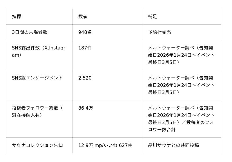 https://www.instagram.com/reel/DVDc_N9j5FY/?igsh=a2ZhMjgyZ2JlczQwHIDANEが運営するサウナ特化メディア「サウナコレクション」(Instagram)にて、本イベントの告知リール投稿を実施。告知投稿(2026年2月22日)は再生数12.9万回、いいね627件を獲得。品川サウナとの共同投稿を行い、フォロワーへのリーチを実現しました。