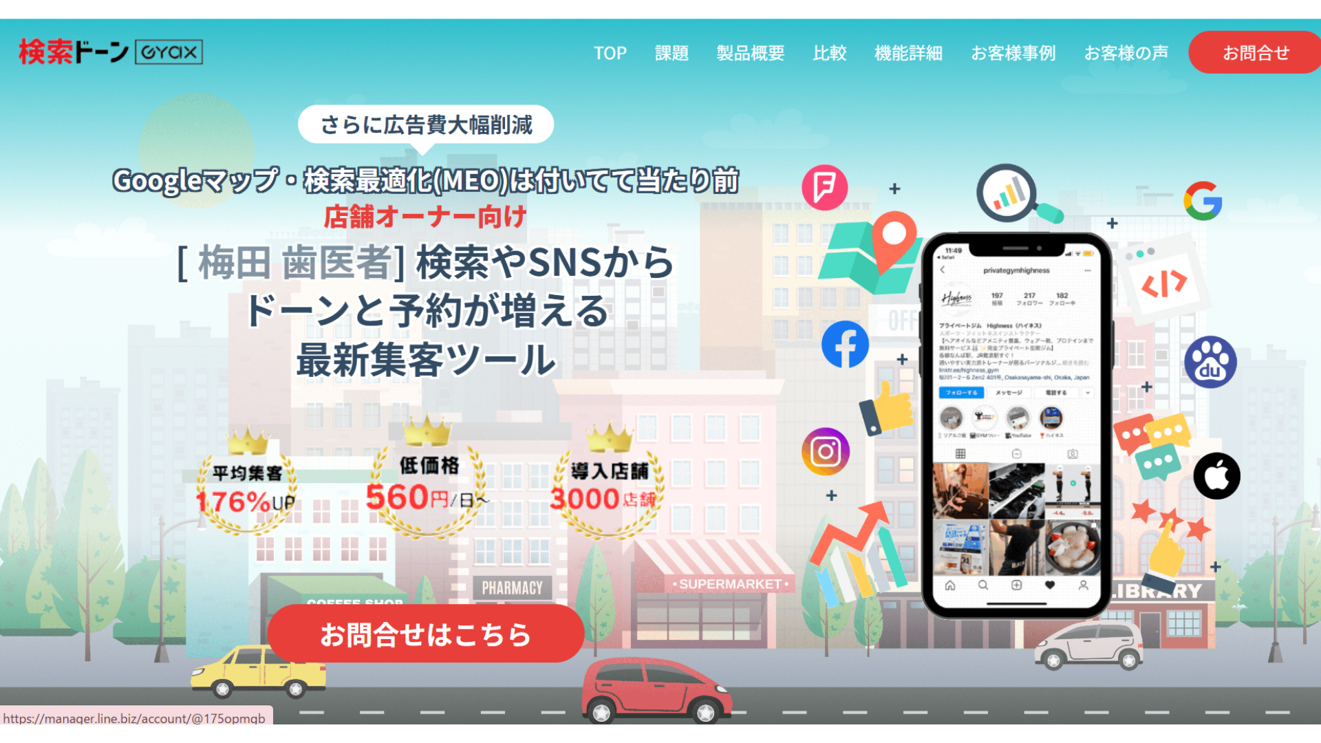 1日わずか約100円で、MEO対策の根幹である「順位の定点観測」から「レビュー改善」、そしてGoogleに評価される「質の高い口コミ獲得」までをワンストップで実現する、AI搭載のMEO対策ツールです。