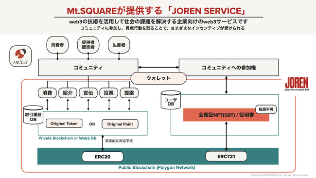 「JOREN」は、転売不可能な会員証NFTおよび証明書NFTの発行・運営を中心に新たな価値創造を提供するサービスです。また、同じ「JOREN」サービス上でトークン(貢献ポイント等)を発行・運営することが可能であり、企業は会員証NFTや証明書NFTと合わせて、さまざまな価値を創造できるようになります。