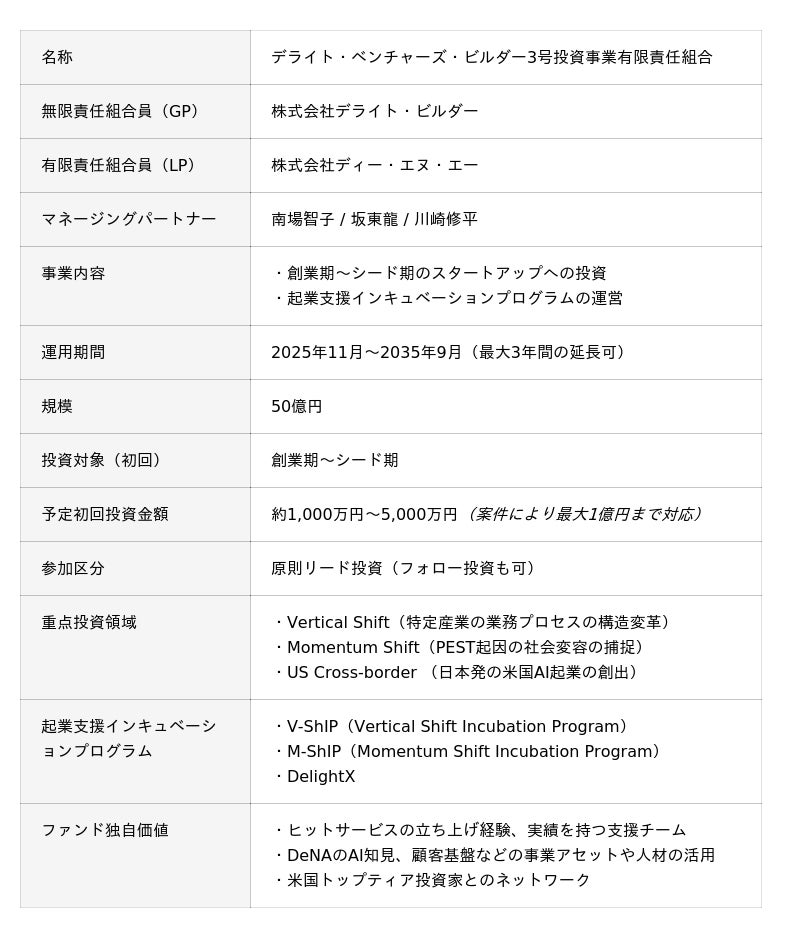 独立系ベンチャーキャピタルのデライト・ベンチャーズ(所在地:東京都渋谷区)は、株式会社ディー・エヌ・エー(以下「DeNA」)を単独リミテッド・パートナー(LP)とする50億円規模の「デライト・ベンチャーズ・ビルダー3号(以下「DVB3」)ファンド」を設立しました。
