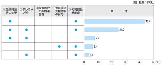 [図表4]である。「1.始業時刻等の変更」と「5.短時間勤務制度」の二つを選択するパターンが43.4%と約4割を占める結果となった。