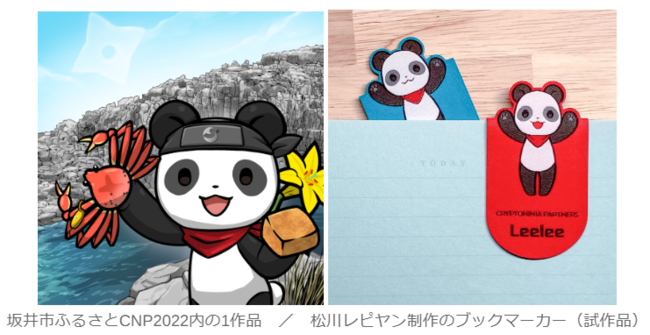 本NFTは、パーツや背景、キャラ等それぞれ異なる組み合わせの合計222種類となり、「坂井市ふるさとCNP2022」では、坂井市の特産品である越前がに、油揚げなど名所である東尋坊、丸岡城などをモチーフにして描いた背景が組み合わされています。メインキャラクターにはCNPの人気キャラクターの「リーリー」を採用し、坂井市を訪れることでNFTのレベルを上げる仕掛けも実装予定です。返礼品NFT保有者特典には、松川レピヤンがふるさとCNP限定のブックマーカーを作成し、ふるさとCNP222体の保有者全員へ提供します。また、NinjaDAOのCNP保有者のみ参加可能なdiscordチャンネルの1か月体験する権利が付与されます。