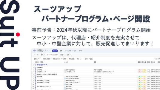 この度、株式会社スーツ(所在地:東京都千代田区、代表取締役社長CEO:小松 裕介)は、チームでかんたん、毎日続けられるプロジェクト・タスク管理ツールの経営支援クラウド「Suit UP」(スーツアップ)のサービスページに新たにパートナープログラム・ページを開設いたしましたので、お知らせします。