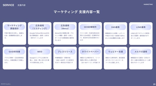 広告運用、SNS運用、SEO、LP改善など分断されがちな業務を統合し、戦略から実行・改善までを一気通貫で支援します。