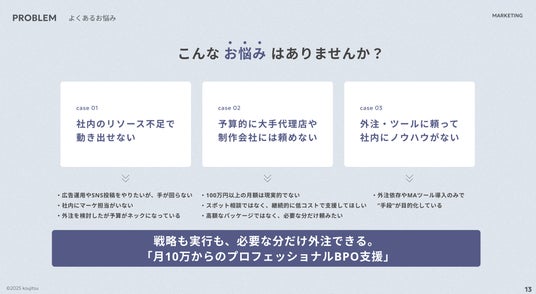 「費用対効果を最大化したい」「SNS・広告・SEOの優先順位を整理したい」など、お悩みに合わせて最適なマーケティングBPO施策をご案内します。