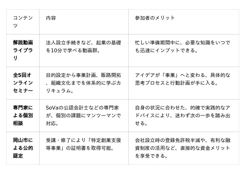 株式会社SoVa今年度は、岡山市の特定創業支援等事業としてSoVaのプログラムを提供
