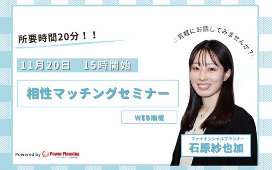 無料マネーセミナー提供サービス「アットセミナー」を運営しているパワープランニング株式会社が「11月20日 (水)15時」に石原紗也加講師によるオンラインの相性マッチングセミナー開催を実施いたします。