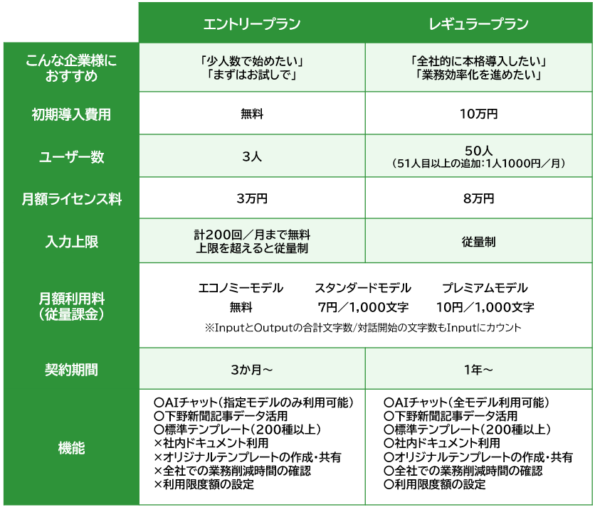 少人数での利用やスモールスタートに最適な「エントリープラン」は、初期費用無料、月額3万円(税別)から手軽にご導入いただけます。3ユーザーまで利用可能で、まずは生成AIの効果を試してみたいという企業様に最適です。