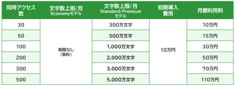 自治体様向けに、登録ユーザー数ではなく「同時アクセス数」に応じた特別なプランをご用意しました。毎月利用できる文字数上限が含まれた定額制のため、予算の見通しが立てやすく、安心してご利用いただけます。