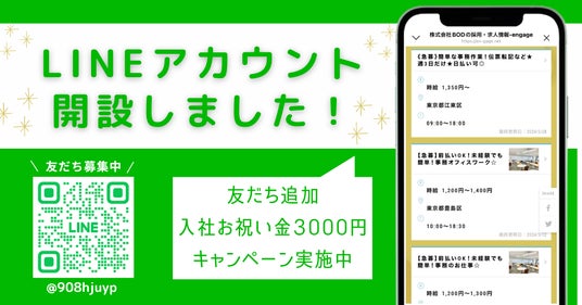 幅広いアウトソーシングのサービスを提供する株式会社 BOD(本社:東京都豊島区、代表取締役:田中 大善、以下 BOD)は、関東圏内での求職者に向けた最新のお仕事情報を発信するLINE公式アカウントを3月2日に開設しましたことをお知らせいたします。また、LINE開設を記念して「入社お祝い金3000円キャンペーン」を実施します。