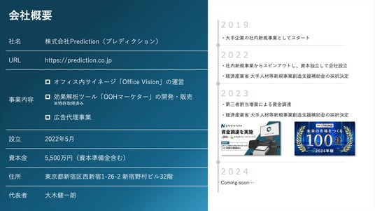 株式会社Prediction(本社:東京都新宿区、代表取締役社長:大木健一朗)は、オフィス内サイネージ広告「Office Vision」の設置台数が1,300台を突破したことをお知らせいたします。また、出社回帰のトレンドが顕著になりつつある昨今、ビジネスパーソンに直接リーチできるオフィス内サイネージの効果が注目されています。これに伴い、広告出稿のニーズも増加し、導入事例も増えたことから、媒体資料をリニューアルいたしました。