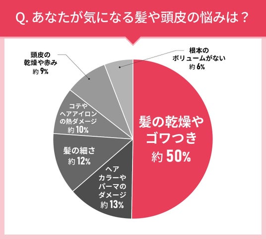 「髪の乾燥やごわつき」が約50%、「ヘアカラーやパーマのダメージ」が約13%、「コテやヘアアイロンの熱ダメージ」が約10%と、日常における髪へのダメージに悩んでいる人が多いことがわかりました。その他、「髪の細さ」や「根本のボリュームがない」という悩みは、髪質や年齢が影響していると考えられます。頭皮トラブルに悩んでいる人も一定数いるようです。