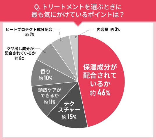 最も多かったのが「保湿成分が配合されているか」の約46%でした。髪の悩みでは1位が「髪の乾燥やゴワつき」でしたので、それに対応する結果となりました。そのほかに関しては、「ツヤ出し成分」や「ヒートプロテクト成分」などのダメージケア、頭皮ケアも重要視していることがわかります。また、毎日使うトリートメントなので、テクスチャーや香り、内容量を気にしている人も多いようですね。