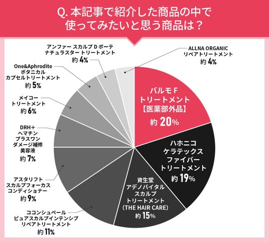 一方の使ってみたい商品に関しては、医薬部外品の商品がトップという結果に。そのほかの商品も、頭皮ケアに着目しているコメントが目立った印象です。髪自体の補修はもちろん、頭皮環境を整える機能をトリートメントに期待している人が多いことが分かりますね。