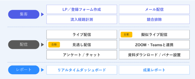 それらを通じて得たお客様の声と親会社である株式会社博展の数多くのイベントノウハウを反映し、“成果の出るウェビナー”を無理なく簡単に続けられる一気通貫型のウェビナーマーケティングツールを制作しました。