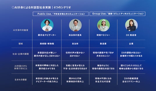 ※「AI分身」は、株式会社ソニーコンピュータサイエンス研究所 笠原 俊一リサーチャーのCybernetic Humanity/CXC(Circular AI Clone) Platform研究の一環として、 日本科学未来館の実証実験公募プログラムにおける「AI分身科学コミュニケーター」の実証実験成果を活用しています。