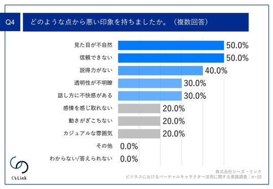 Q1で「やや悪い」「非常に悪い」と回答した方に、「Q4.どのような点から悪い印象を持ちましたか。(複数回答)」(n=10)と質問したところ、「見た目が不自然」が50.0%、「信頼できない」が50.0%、「説得力がない」が40.0%という回答となりました。