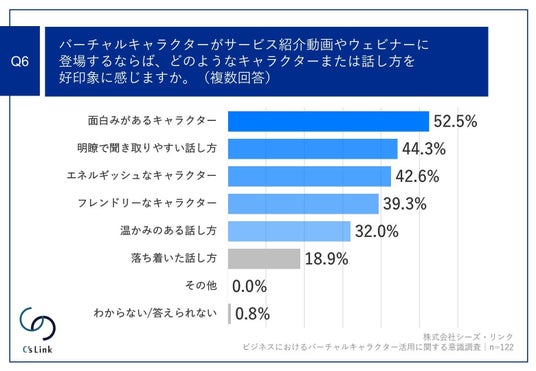 「Q6.バーチャルキャラクターがサービス紹介動画やウェビナーに登場するならば、どのようなキャラクターまたは話し方を好印象に感じますか。(複数回答)」(n=122)と質問したところ、「面白みがあるキャラクター」が52.5%、「明瞭で聞き取りやすい話し方」が44.3%、「エネルギッシュなキャラクター」が42.6%という回答となりました。