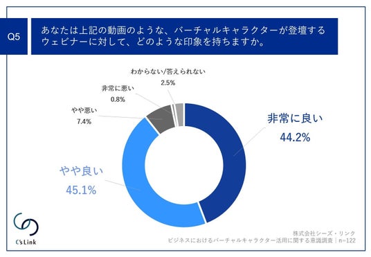 「Q5.あなたは上記の動画のような、バーチャルキャラクターが登壇するウェビナーに対して、どのような印象を持ちますか。」(n=122)と質問したところ、「非常に良い」が44.2%、「やや良い」が45.1%という回答となりました。