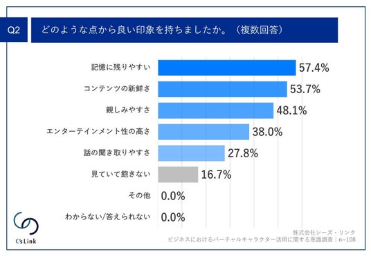 Q1で「非常に良い」「やや良い」と回答した方に、「Q2.どのような点から良い印象を持ちましたか。(複数回答)」(n=108)と質問したところ、「記憶に残りやすい」が57.4%、「コンテンツの新鮮さ」が53.7%、「親しみやすさ」が48.1%という回答となりました。