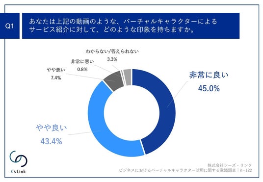 「Q1.あなたは上記の動画のような、バーチャルキャラクターによるサービス紹介に対して、どのような印象を持ちますか。」(n=122)と質問したところ、「非常に良い」が45.0%、「やや良い」が43.4%という回答となりました。